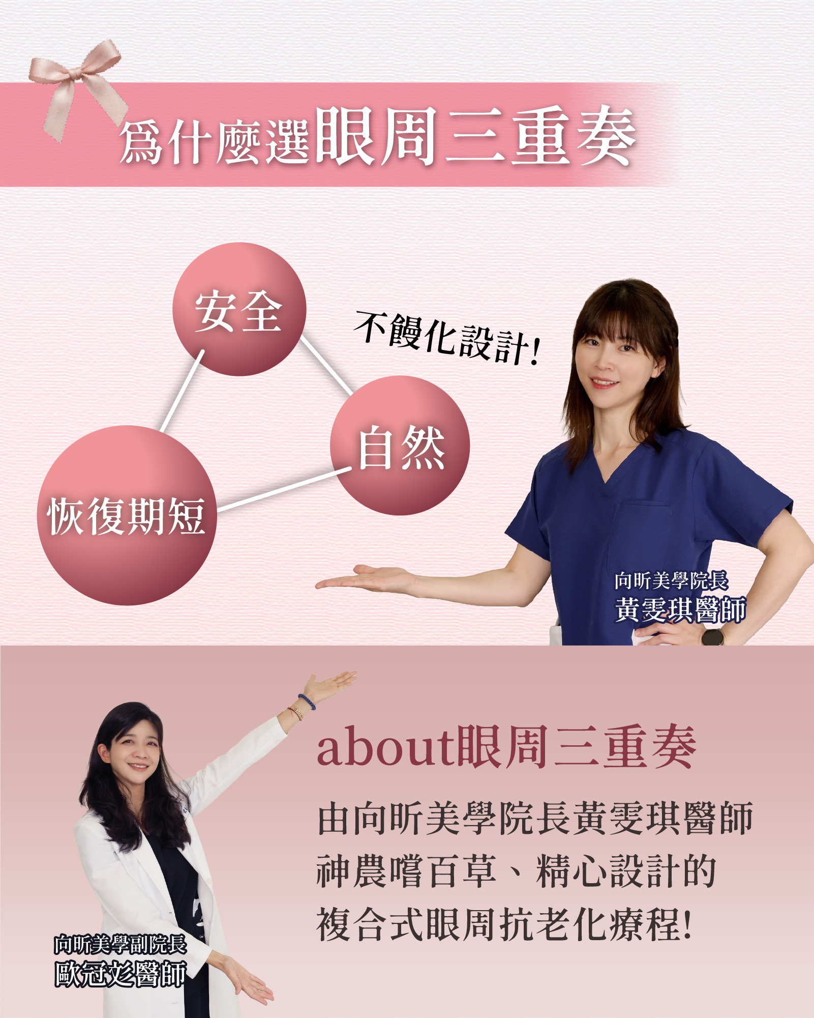 眼睛是最容易洩漏年齡的部位。向昕美學精心設計「眼周三重奏」複合式療程,三種技術分工合作,從不同層次全面對抗眼周老化。