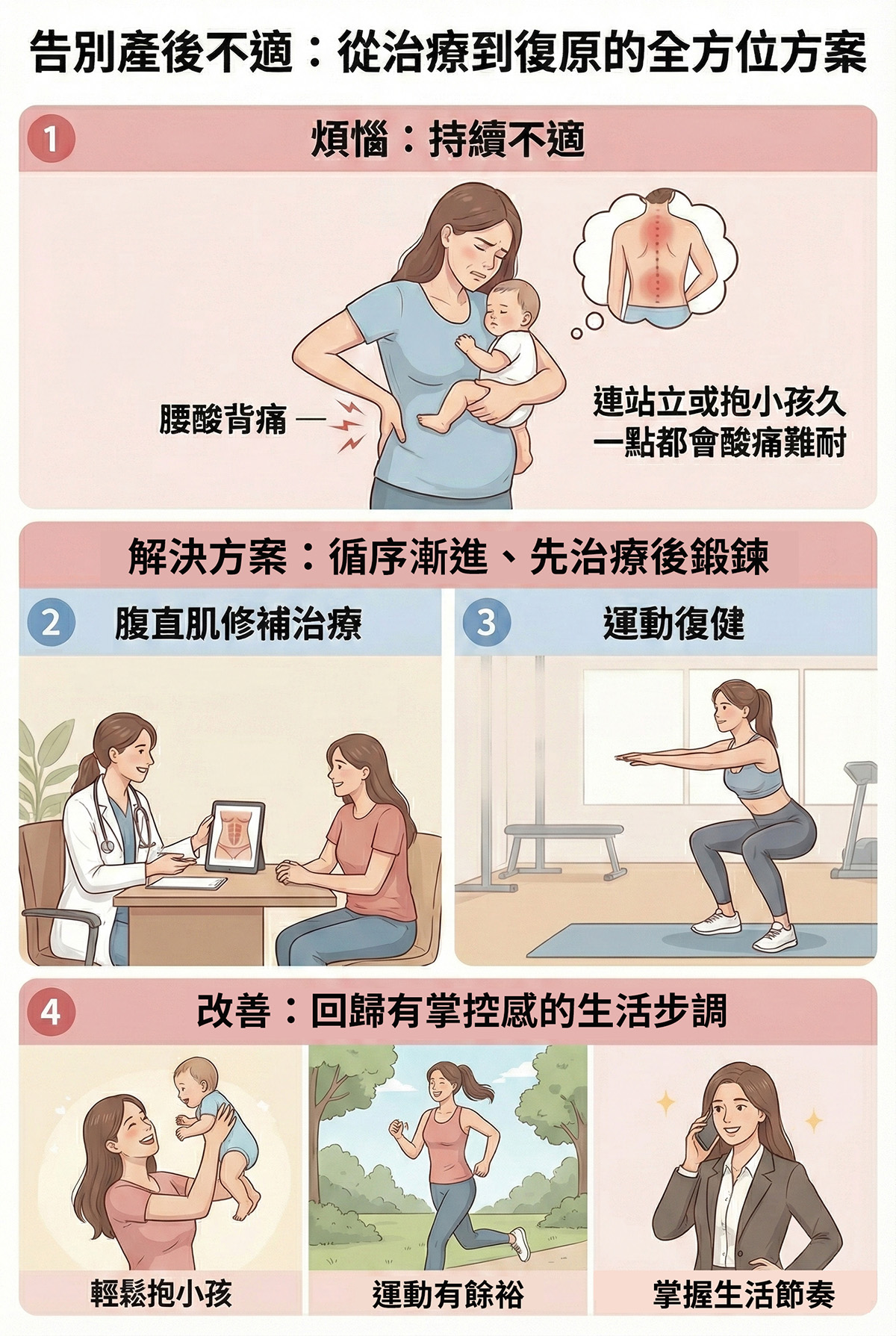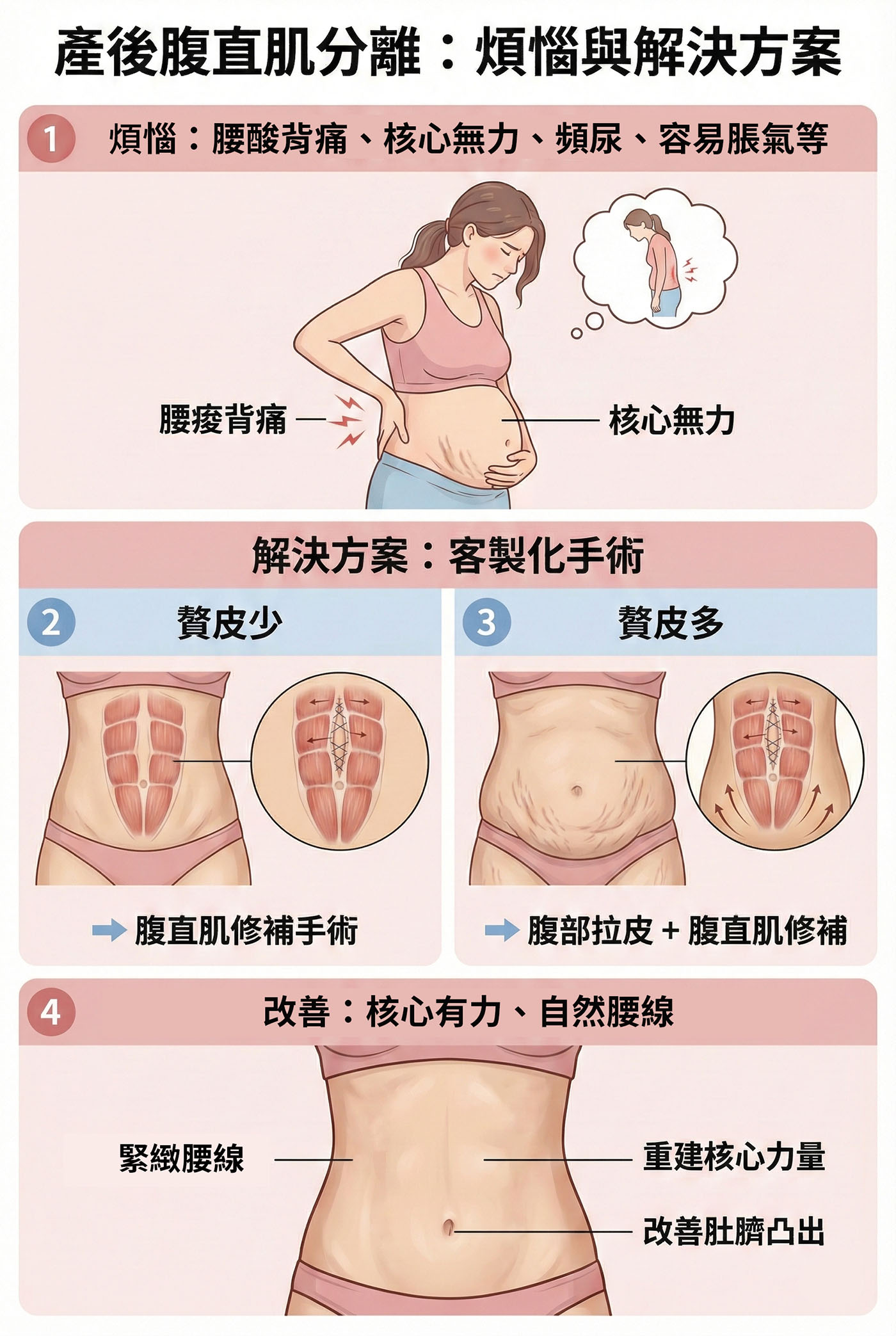 📌 解方:腹直肌修補+腹部拉皮產後的腰痠背痛是因為腹直肌分離、核心鬆弛,身體失去支撐力,連站立或抱小孩久一點都會酸痛難耐。有些媽媽甚至覺得產後的背比孕期還痠,多休息也無法緩解,日常生活被疼痛綁架,久而久之導致心情沮喪;長期下來,影響健康,連伴侶相處也難以親密互動。