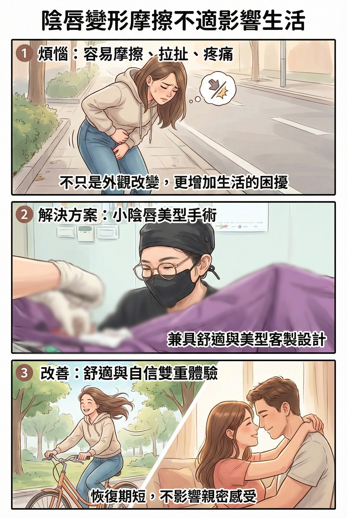 產後許多女性會發現自己陰唇形狀改變,有的變得過長,有的變得不對稱,尤其在騎腳踏車、穿緊身褲、走路摩擦時會產生明顯不適感。外觀上不易被察覺,卻會在生活細節中反覆出現干擾。更敏感的是,在親密關係中若對方觸碰到自己不自在的部位,也會讓媽媽感到羞愧或緊張,無法放鬆。事實上只要透過手術調整,不為了美觀,自己也能更舒服、更自在。