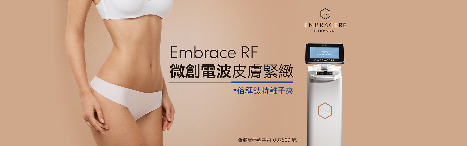 Embrace RF (俗稱鈦特離子夾)是一套專為「深層緊膚」與「微創體雕」設計的射頻平台,系統包含多款探頭,其中 BodyTite、FaceTite、AccuTite 分別用於不同身體與臉部區域的深層緊膚治療。