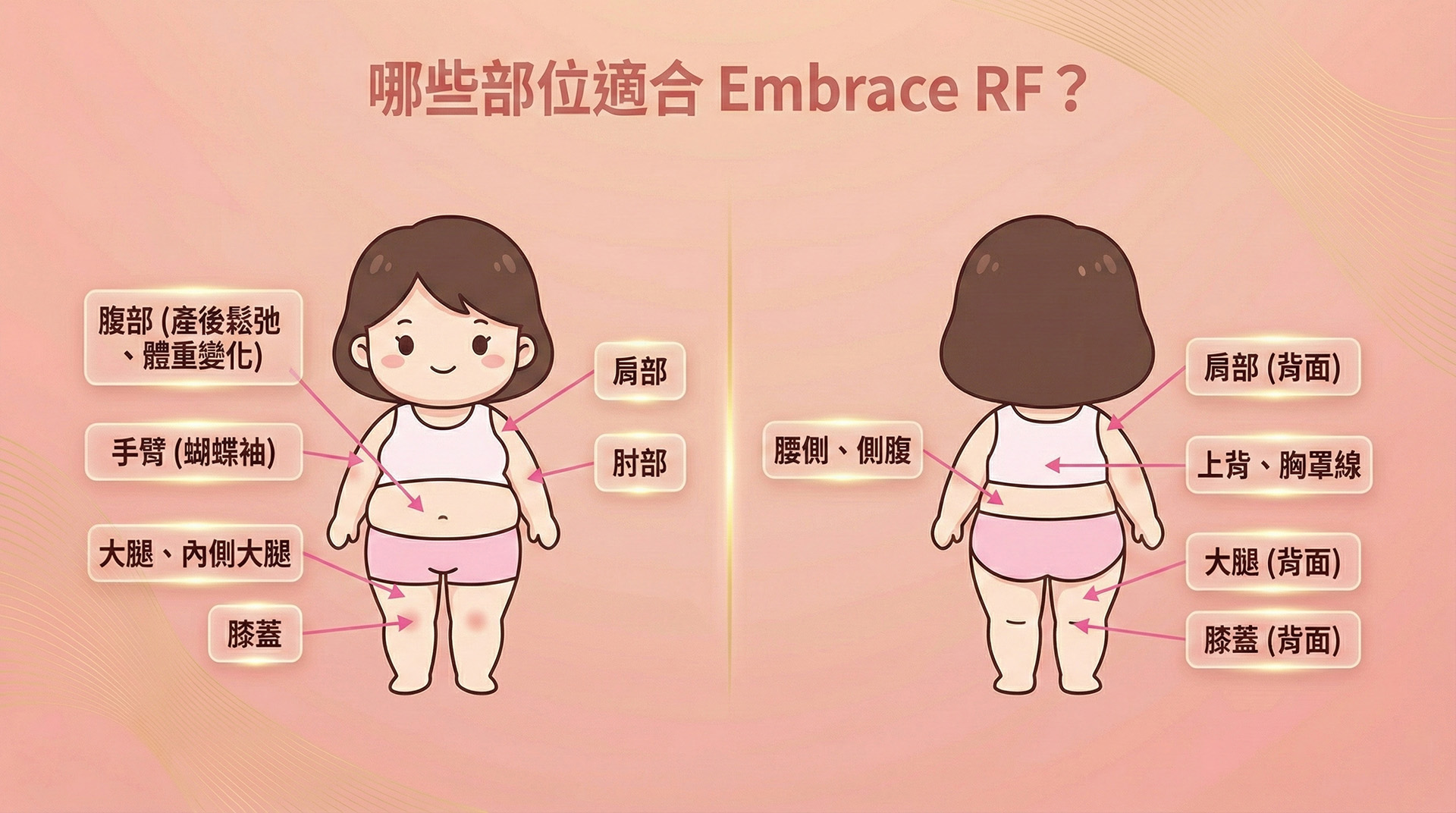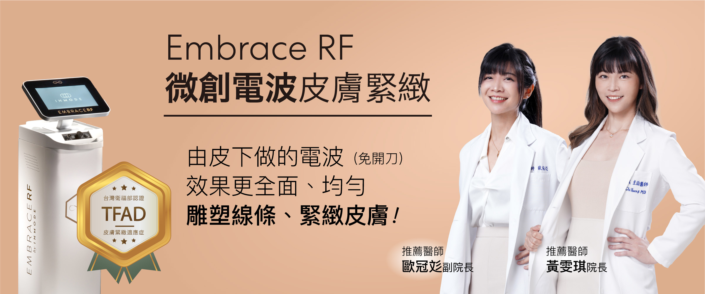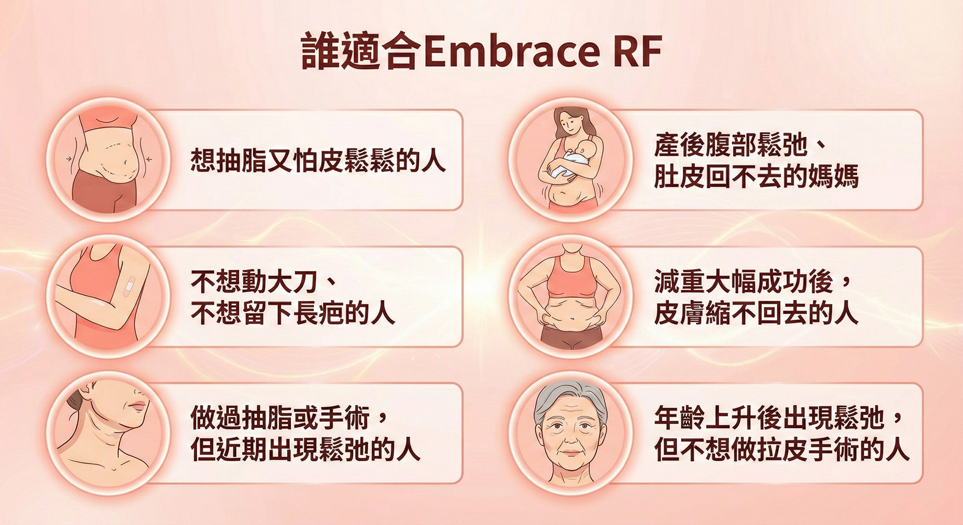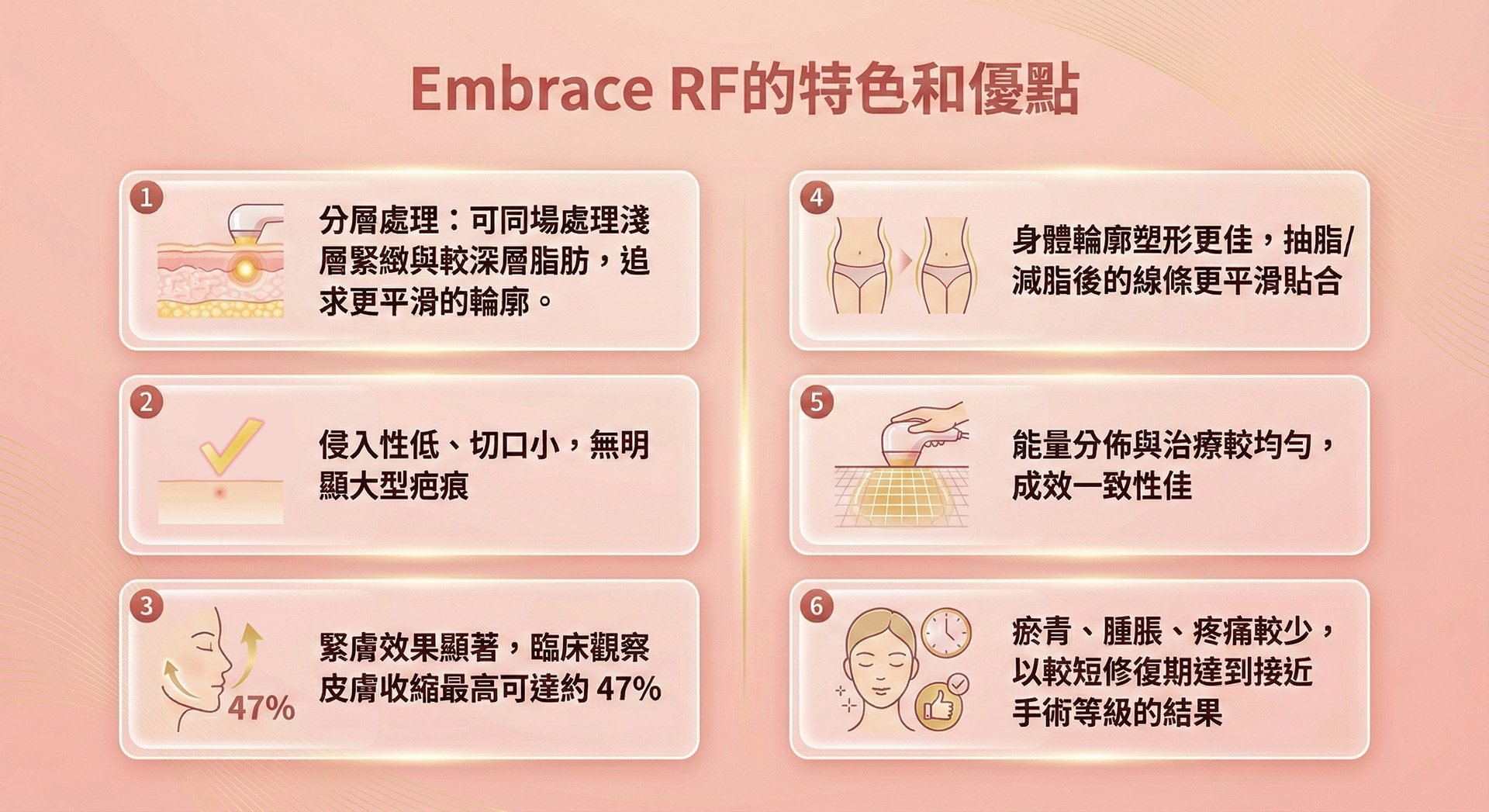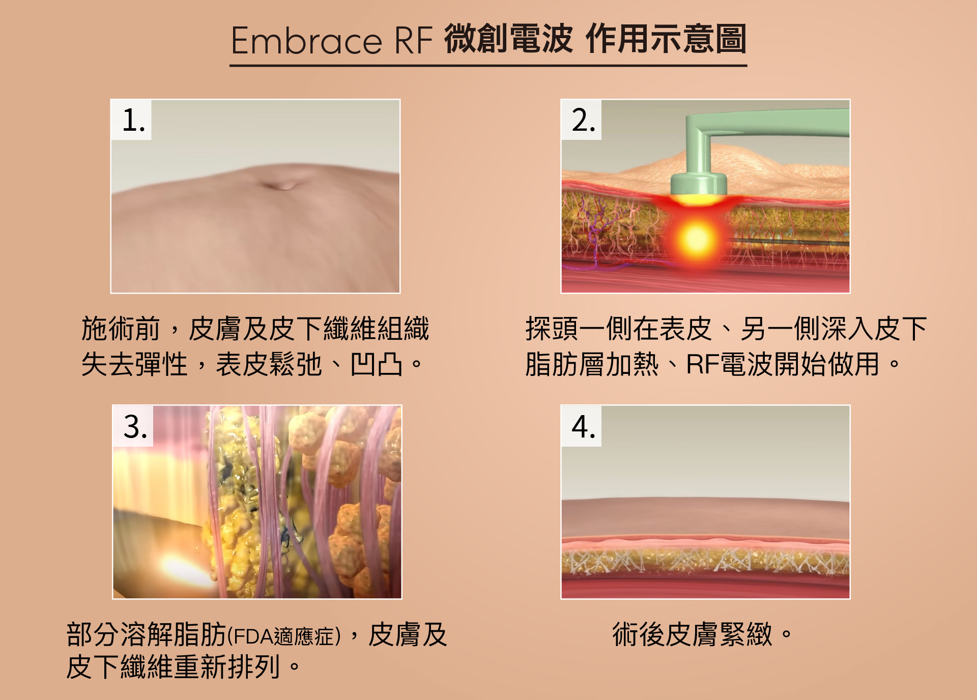 2016 年通過美國 FDA 510(k) 的一種微創體雕療程,利用射頻輔助溶脂(RFAL)在醫師即時監控下做「溫控加熱」,同時作用三個層次:真皮、皮下纖維中隔(subdermal connective tissue matrix),以及脂肪溶解(FDA適應症)。相比只能處理皮膚表面的能量緊膚,Embrace RF 能深入到皮下纖維中隔與脂肪層,像是從「內部幫皮膚熨平」,讓肌膚更緊、更平滑,也能搭配抽脂塑造更立體的線條。而且無需大範圍切除皮膚、切口小、恢復期短,是介於抽脂與拉皮之間的黃金微創方案。