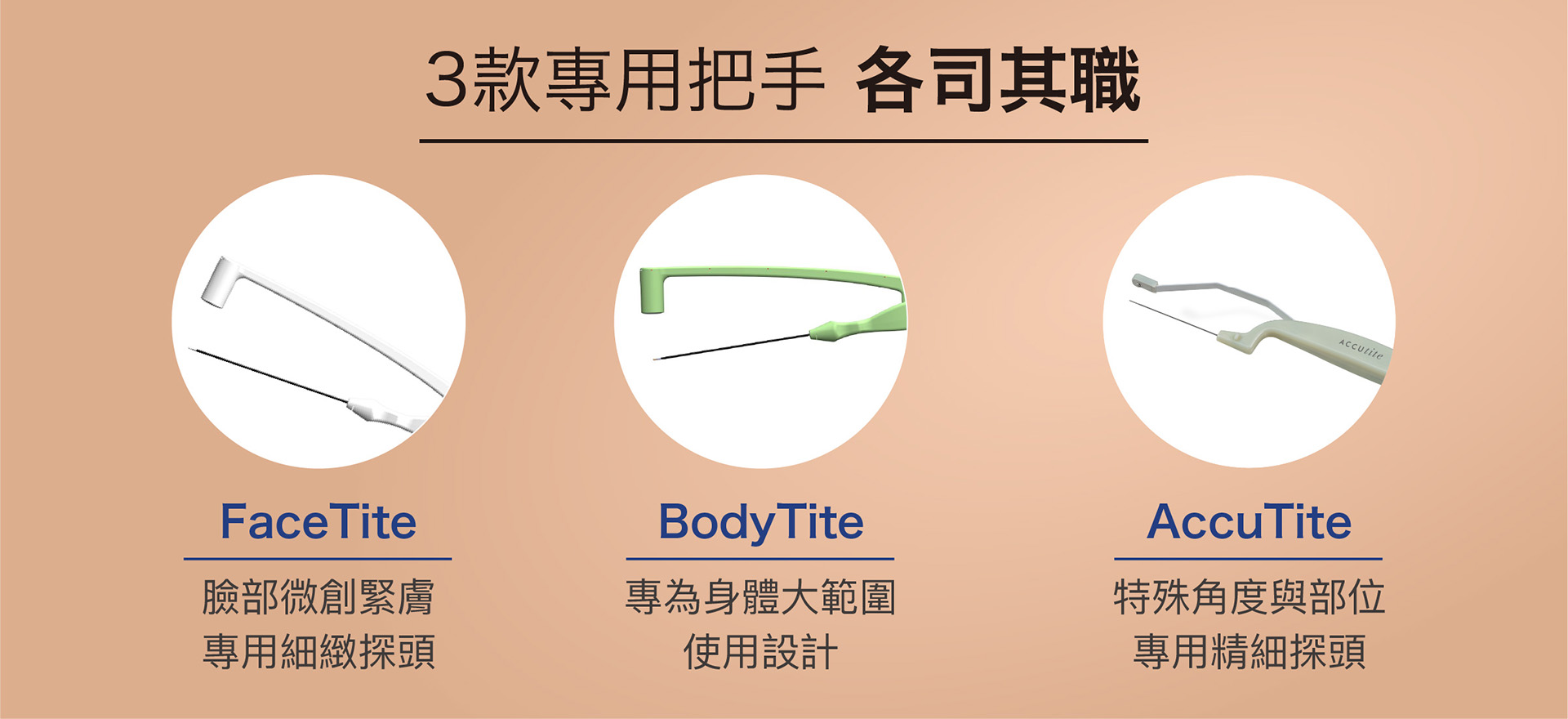 AccuTite 是整個 Embrace RF 系統中體積最小、精準度最高的微創探頭,設計用於處理狹小或敏感、精細的區域。