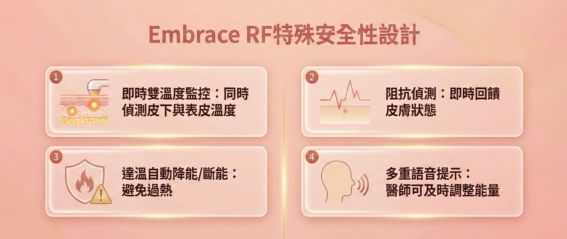 很多人最擔心的是:「這種會加熱的療程,真的安全嗎?」Embrace RF的設計核心,就是把溫度控制得又快又精準,讓醫師在治療時可以「看得到」、「感受得到」、「即時調整得到」。整個系統不只是加熱,而是透過多重監測來保護你的皮膚——避免過熱、避免受傷、避免能量不均。簡單說,就是在有效緊膚和安全界線之間取得最好的平衡。